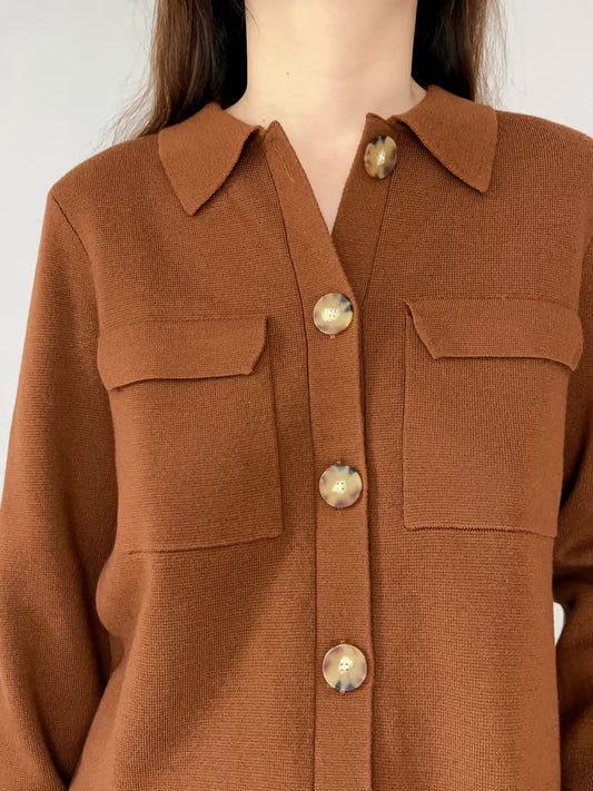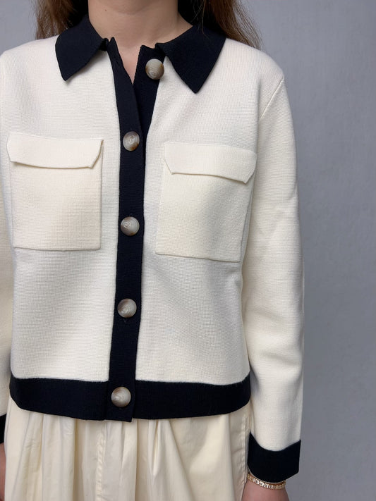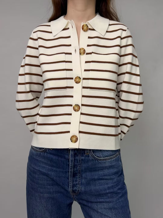 Betty Merino Wool Cardigan in Ecru/Camel Stripe