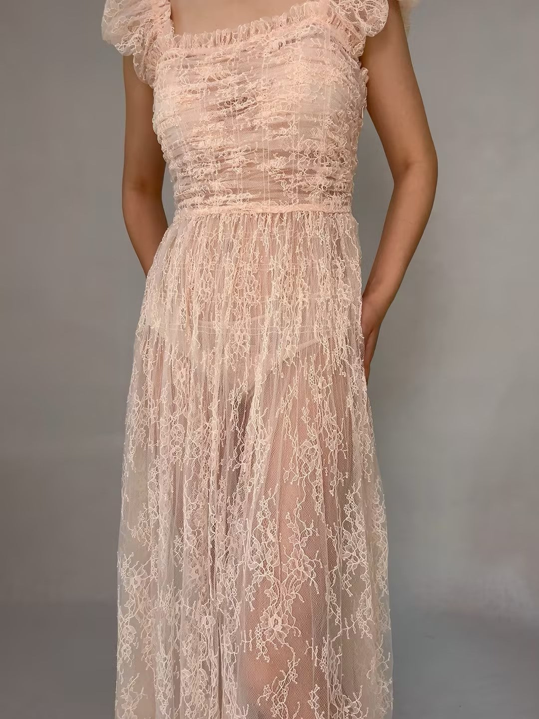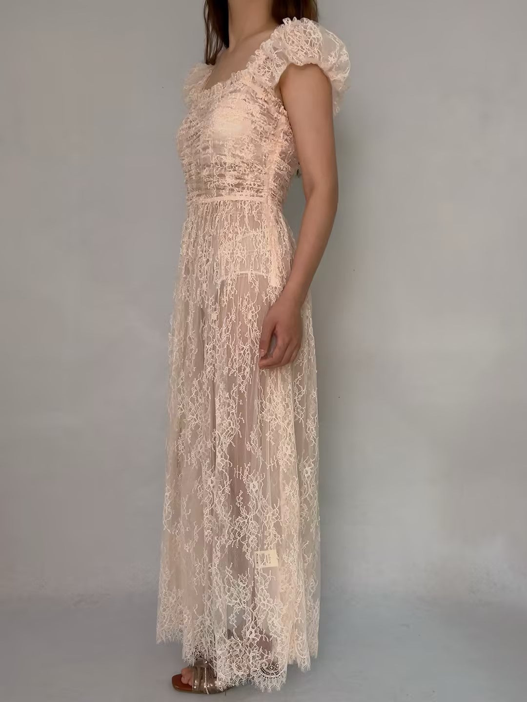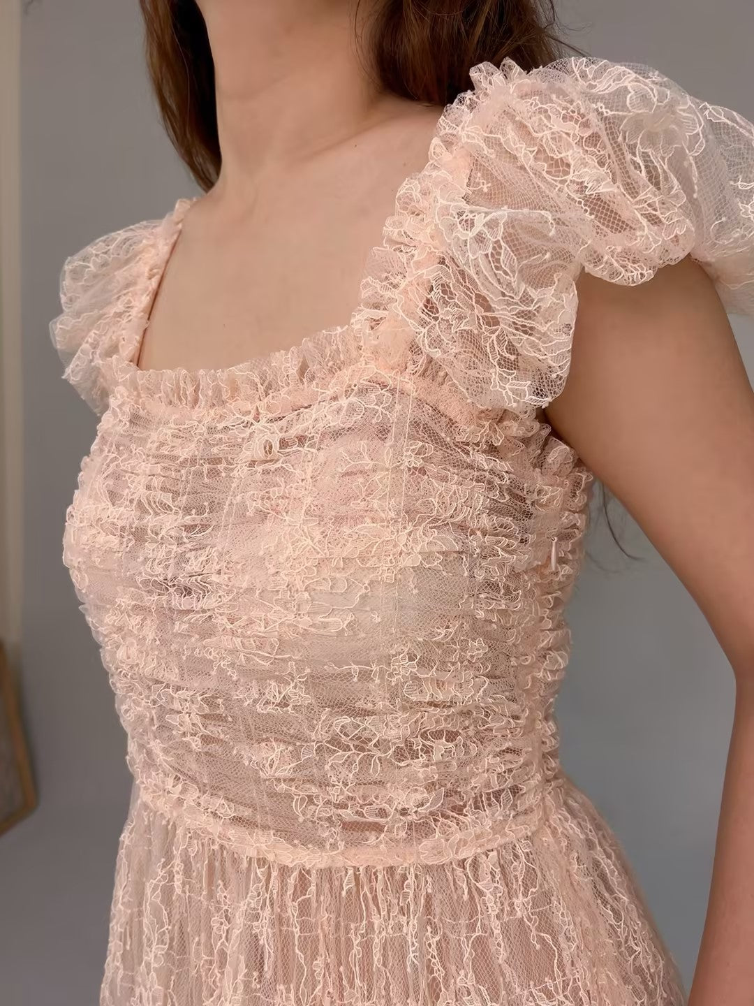 Features: suited to special ocassions, puffed sleeves, square neckline trimmed with ruffles and tap at the shoulder.
