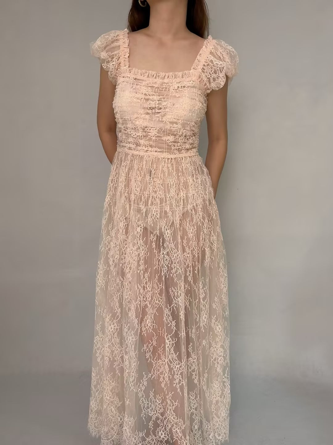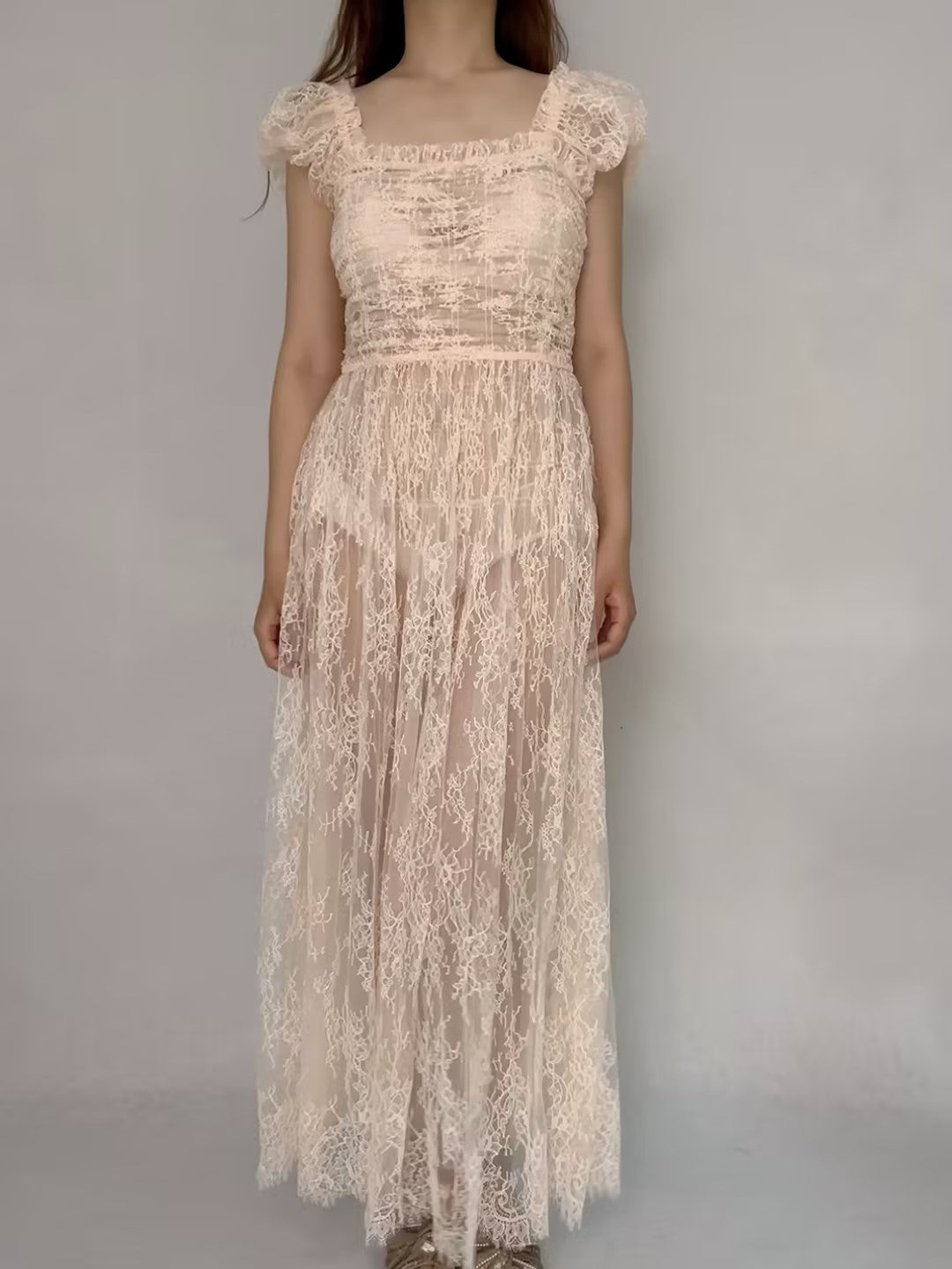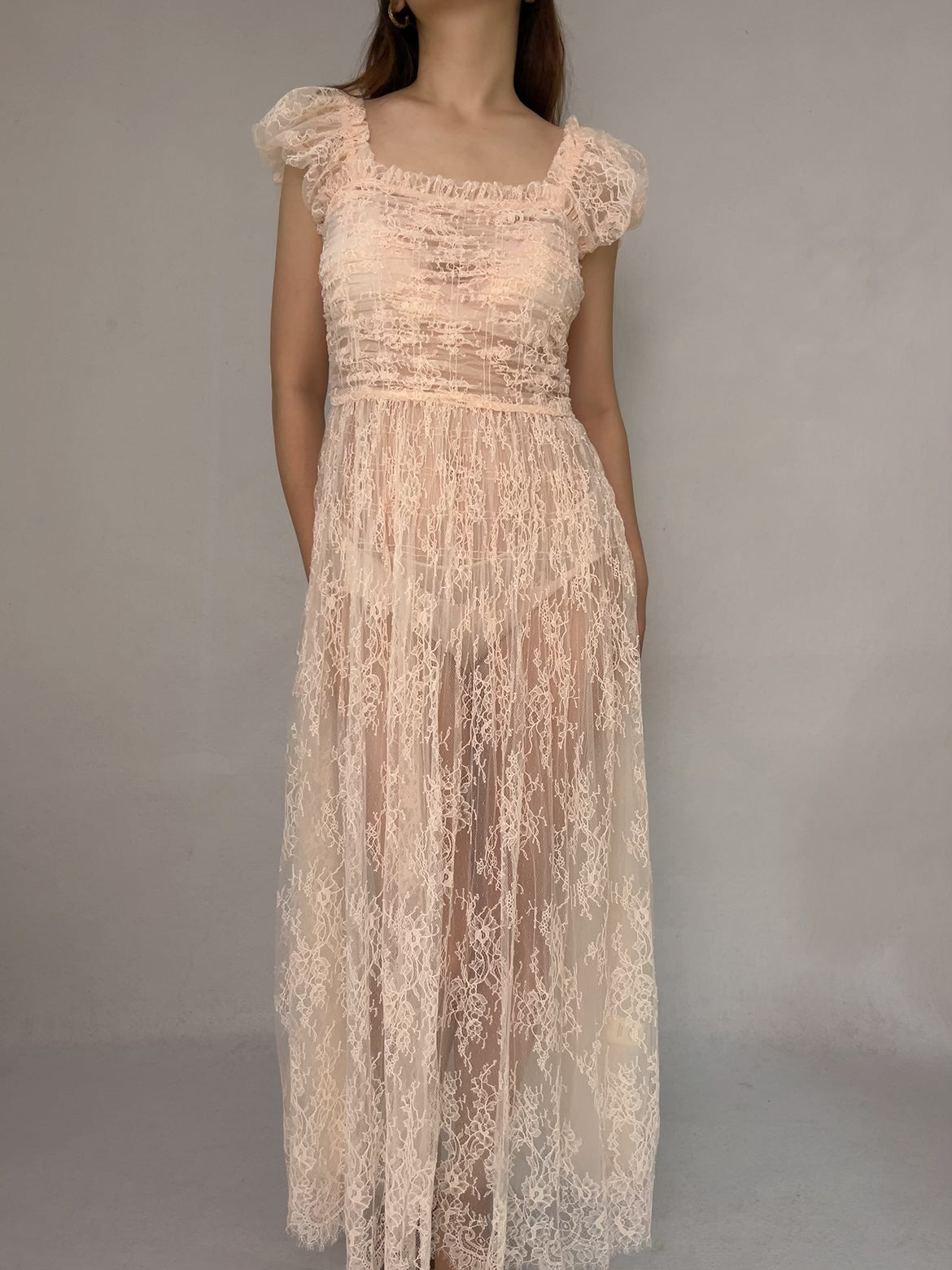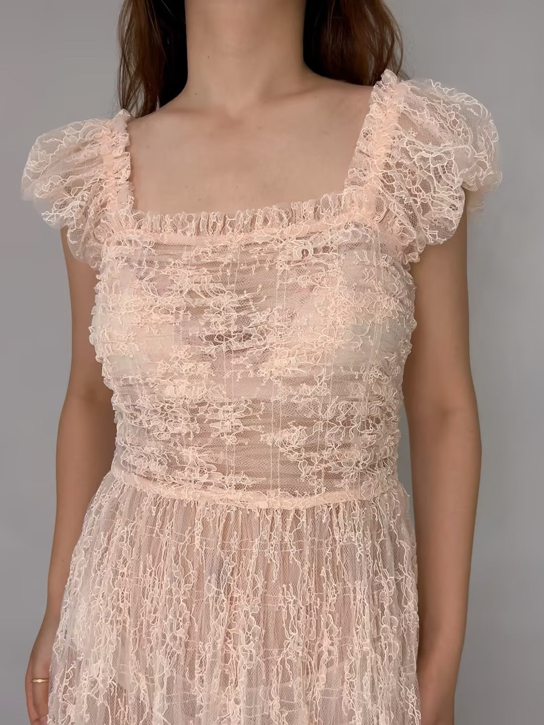 Features: suited to special ocassions, puffed sleeves, square neckline trimmed with ruffles and tap at the shoulder.