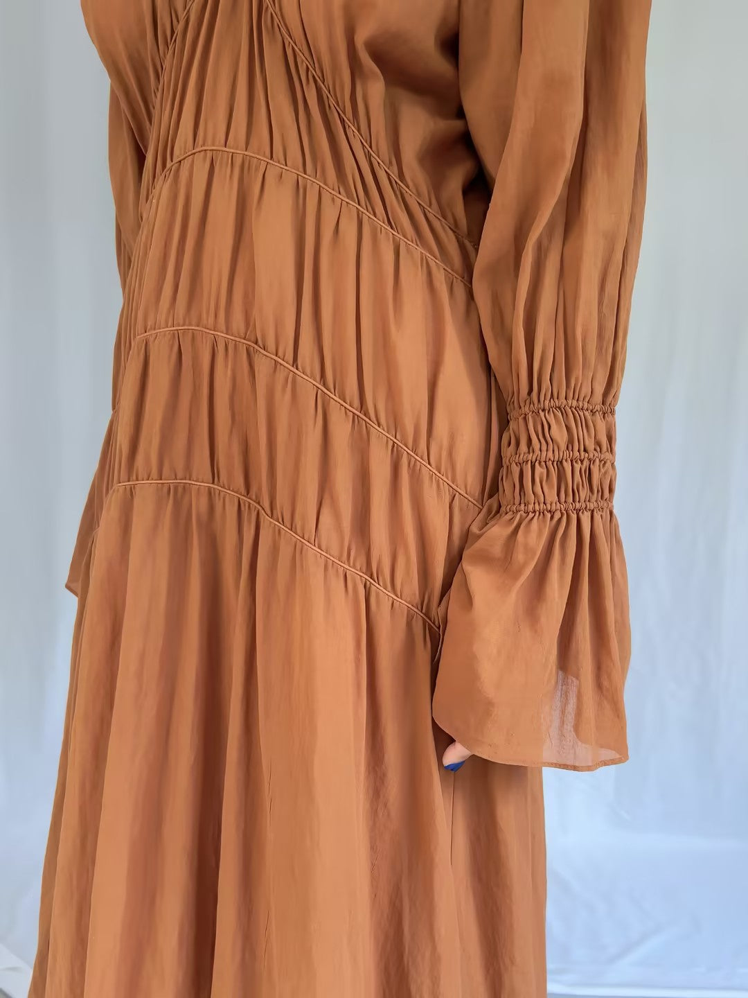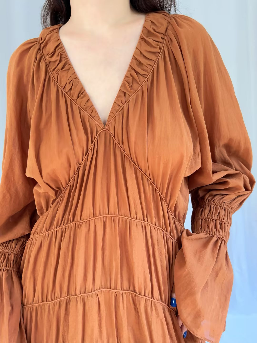 Features smocked, organic cotton, V-neck and bell sleeves. Authentic extra stock in new with tag condition. Retail Price $597 USD.