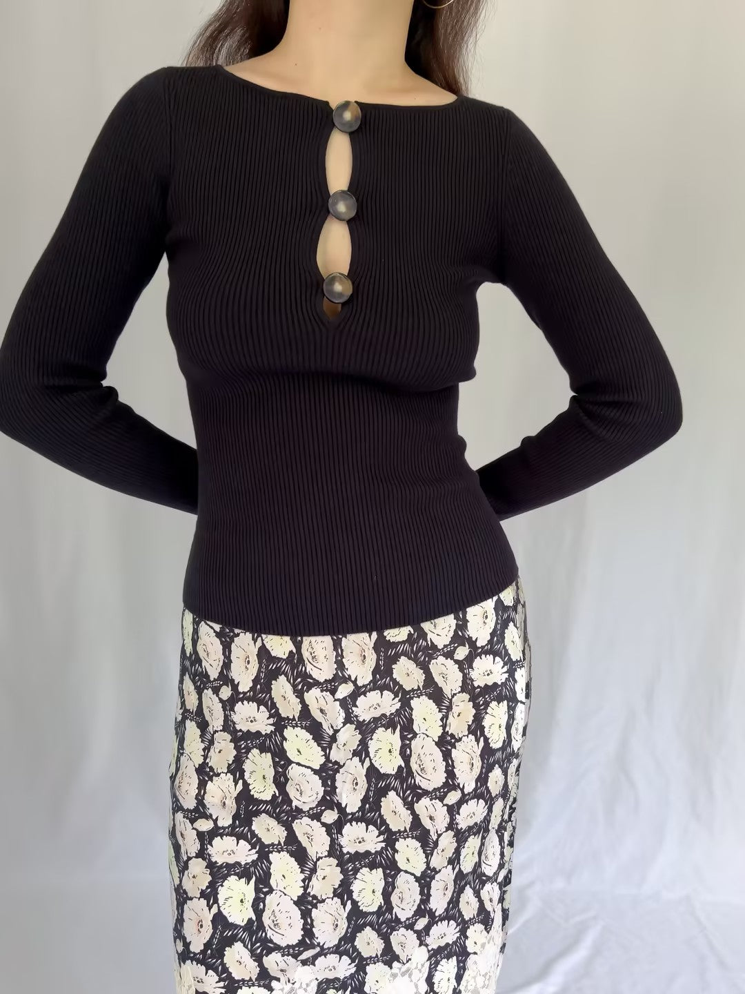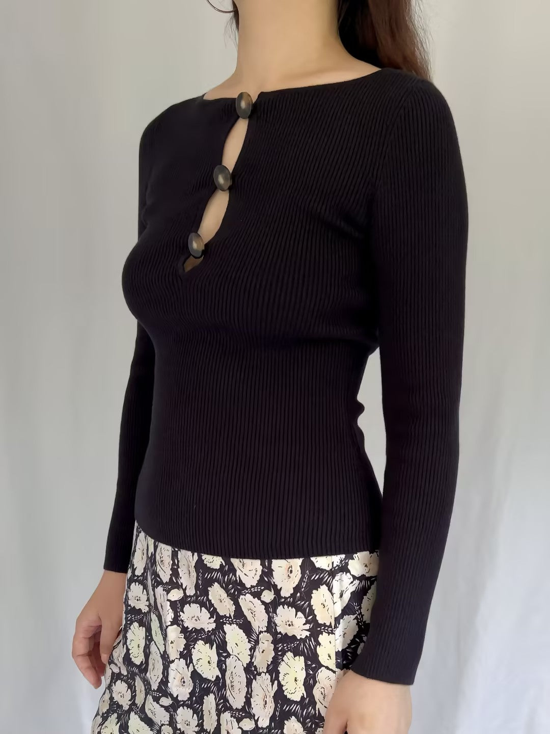 Features fitted sweater in merino wool and organic cotton, ribbed knitting, round neckline closed by 3 buttons. Authentic overruns with brand/material tag. Retail price $160 USD.