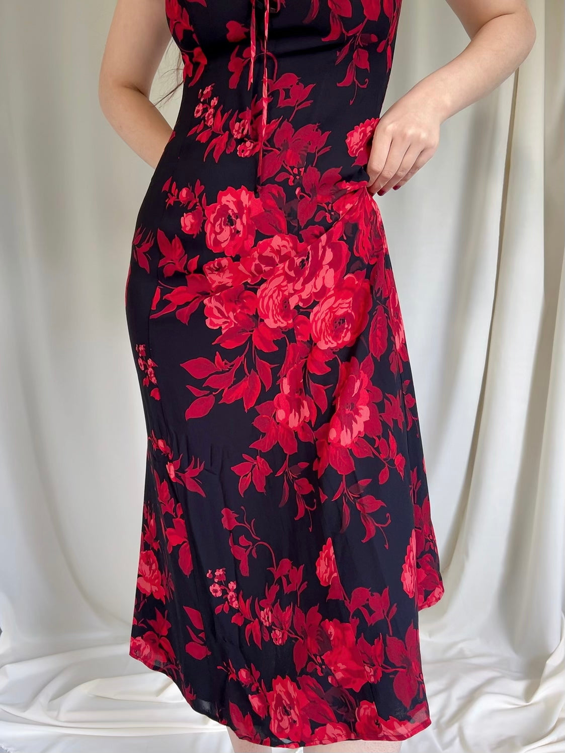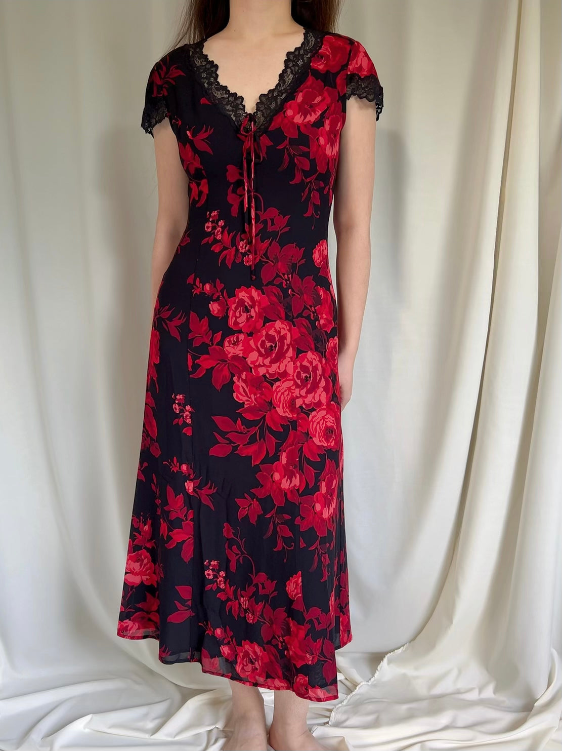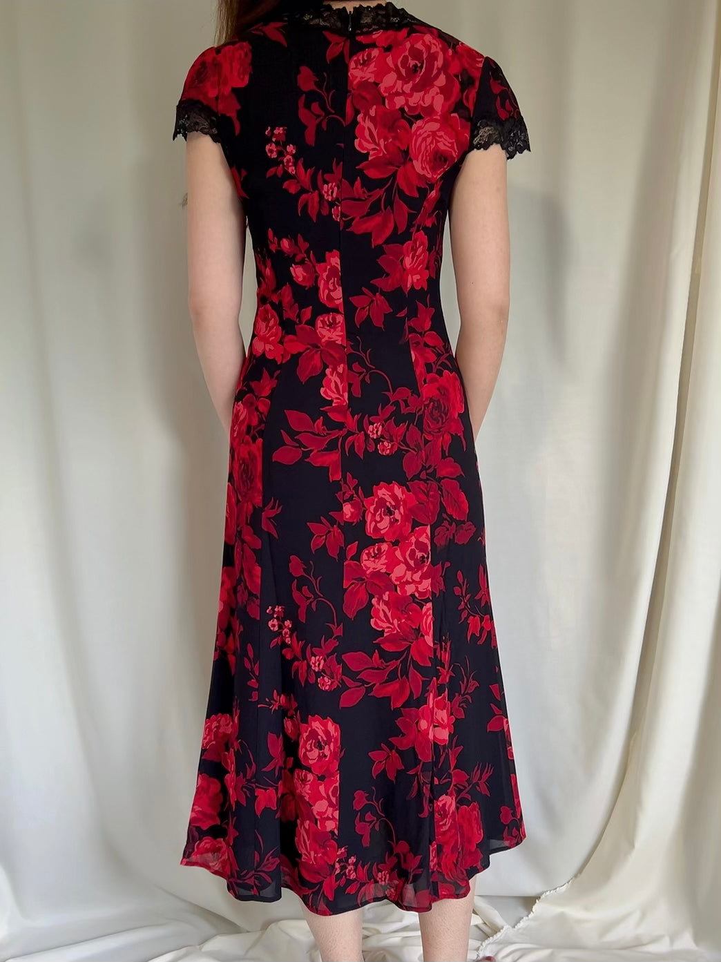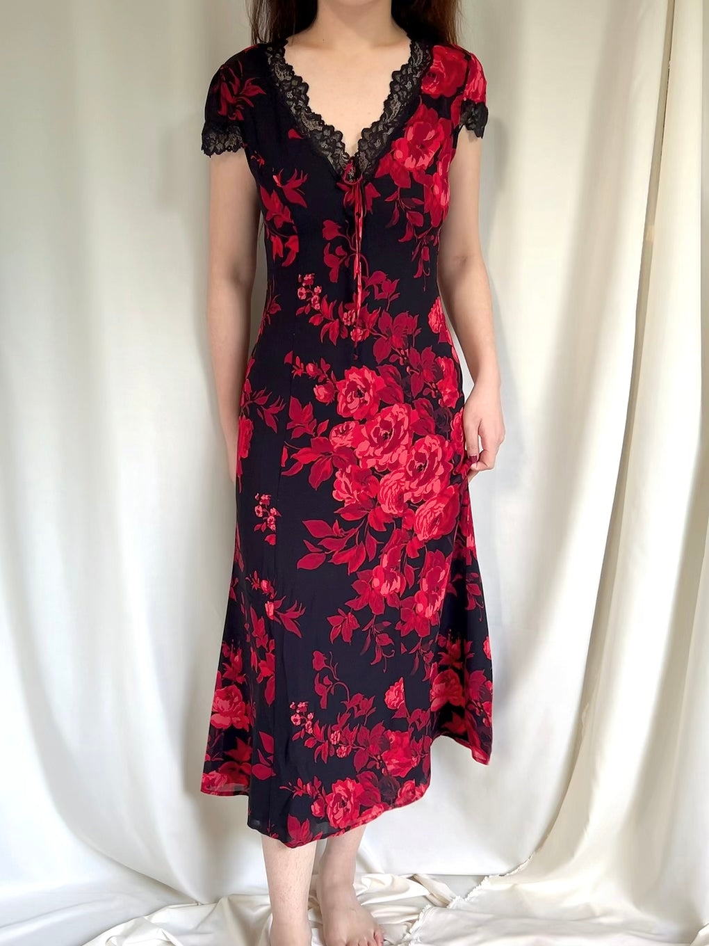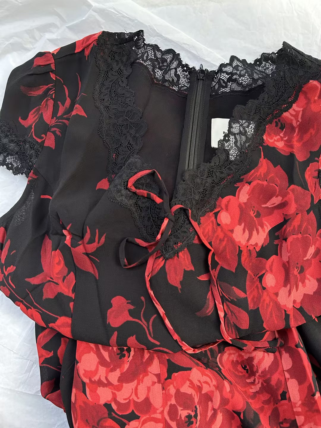 Tissu en maille pointelle, broderies complexes sur toute la surface, manches longues et fines, encolure carrée, corsage flatteur qui épouse le corps et tombe sur une jupe aérée. Authentique issu des stocks restants, avec étiquette de cou/d'entretien. Prix de détail 495 USD.