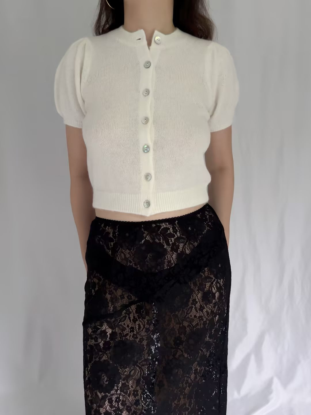 Features a crew neck, short puffed sleeves, and shell buttons. Hitting at the true waist, it pairs beautifully with high-waisted jeans and dresses alike. Authentic overruns, without brand tag, material tag is replaced, only with original size tag. Retail Price $278 usd.