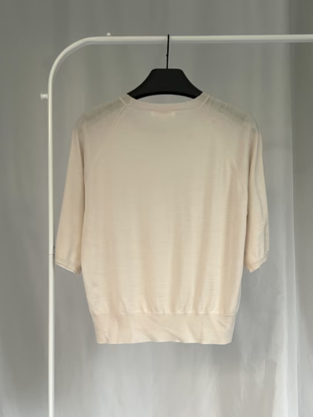 Features short-sleeve crewneck sweater. Authentic sample with brand tag, without material tag. Retail price $242 usd.
