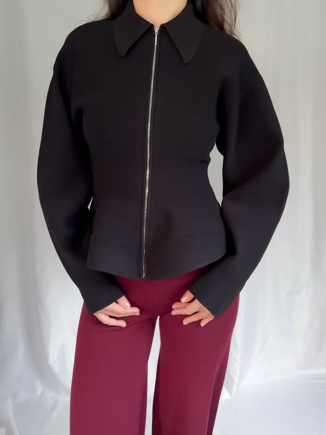 Features fit-and-flare, sculpting compact knit with a crisp peplum hem and exposed front zip,signature silver hardware at the back collar. Authentic extra stock with brand/material tag. Retail price $548 USD.