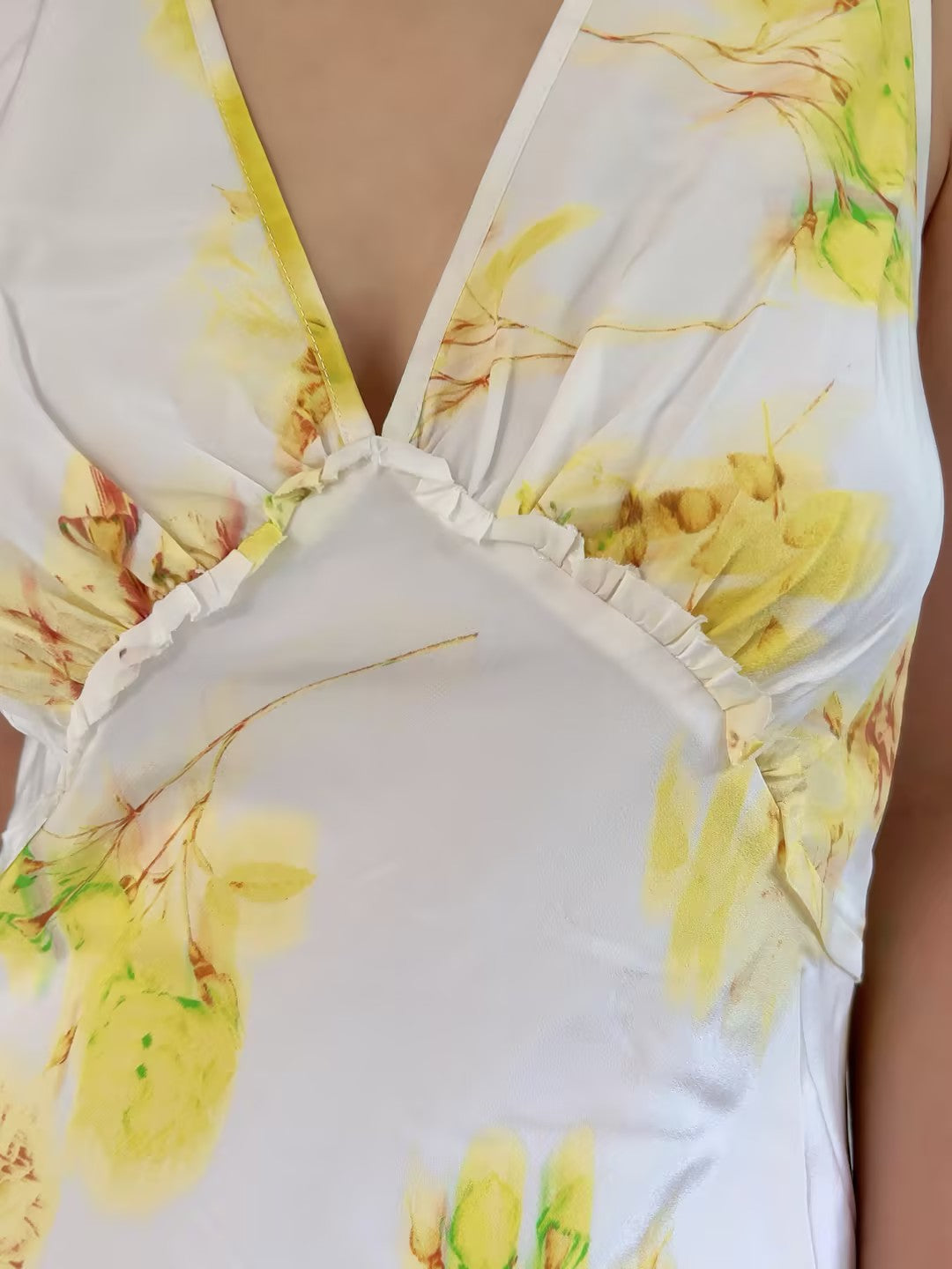 Features delicately cut on the bias from floaty silk crepe de chine, a custom floral print, seamlessly fusing both vintage and modern design elements. Authentic sample with brand tag. Retail price $349 USD.