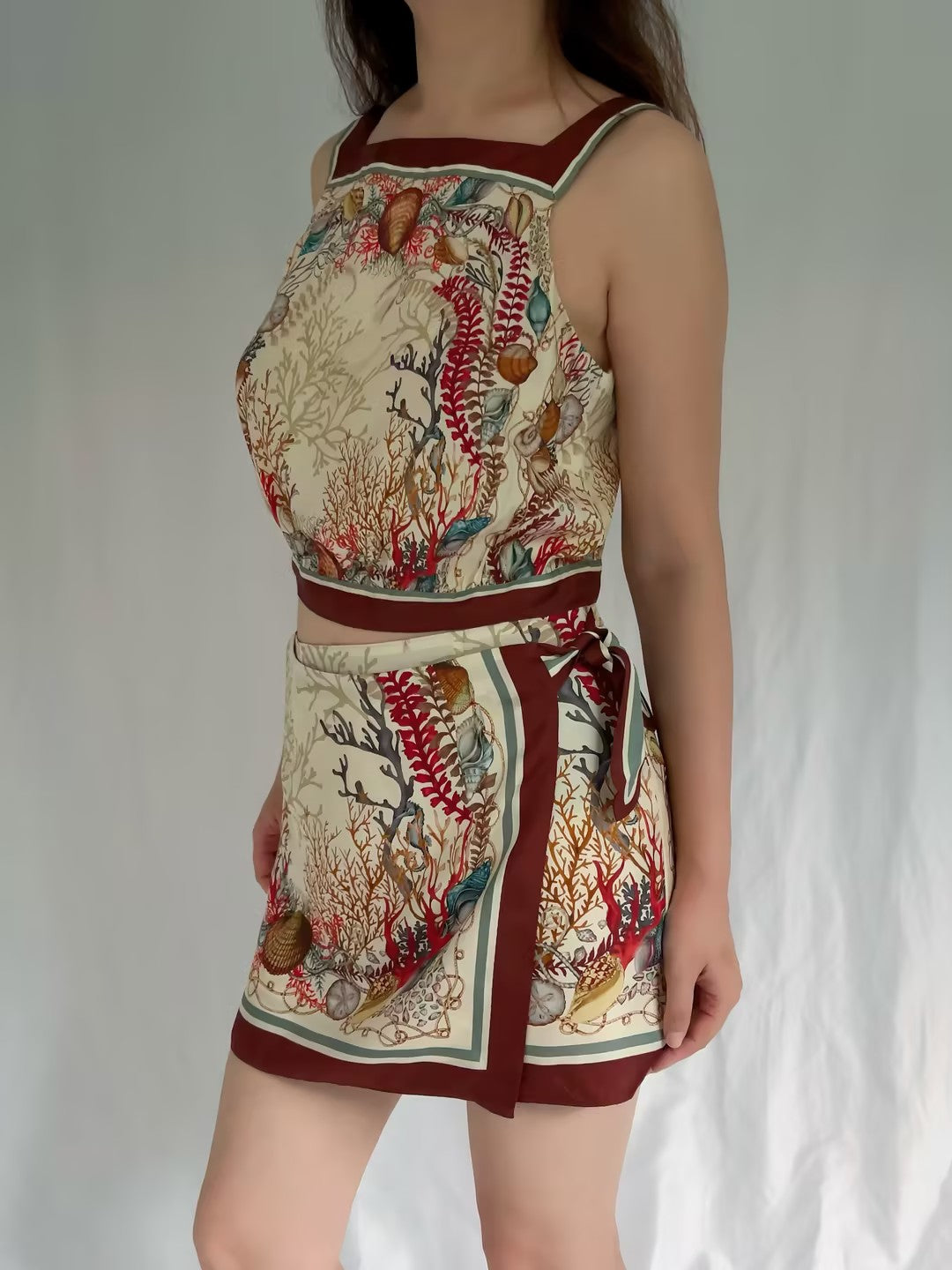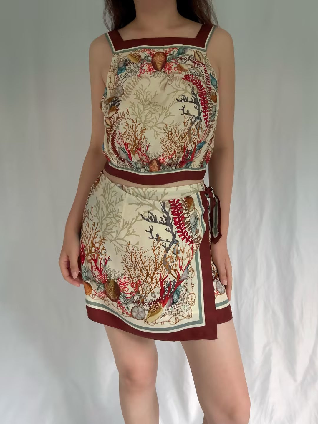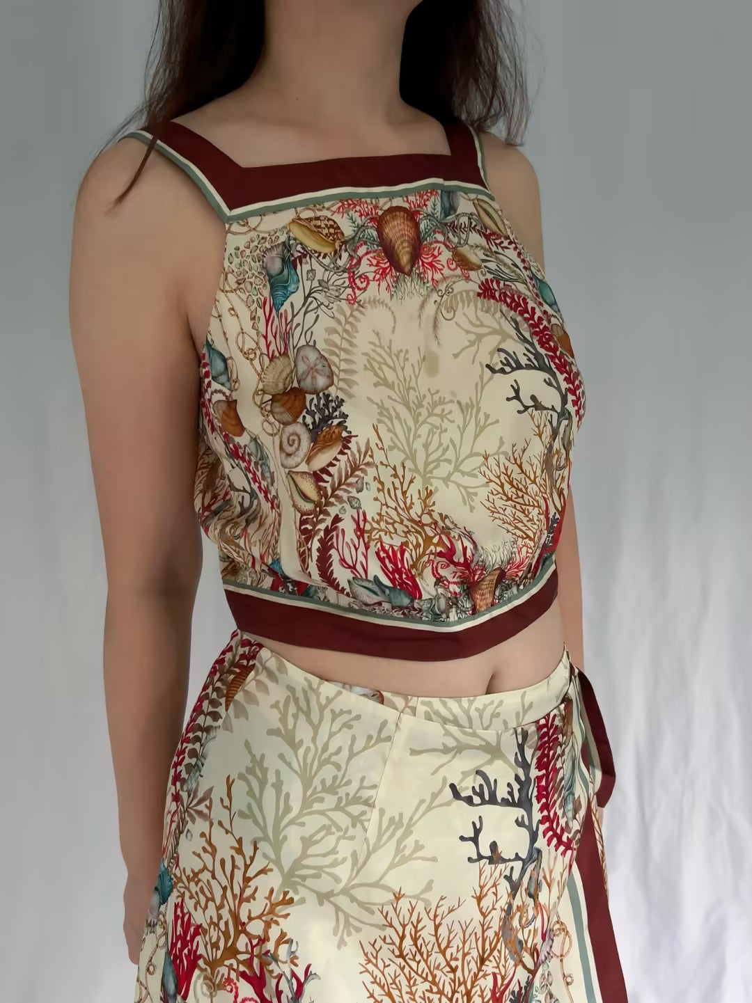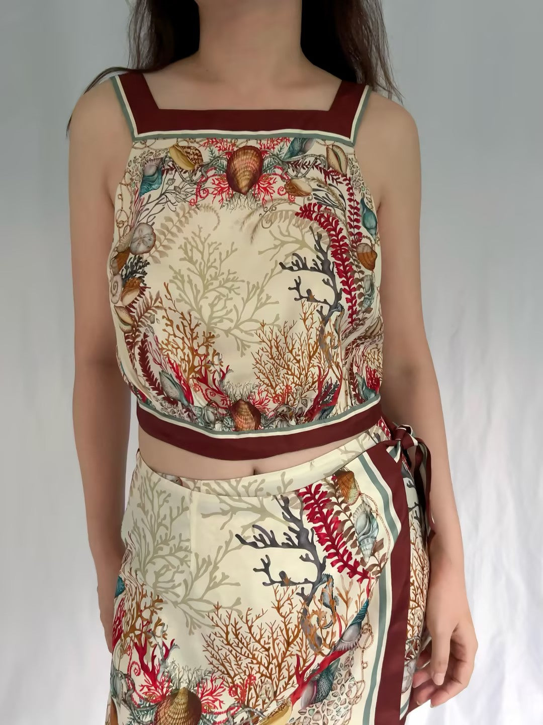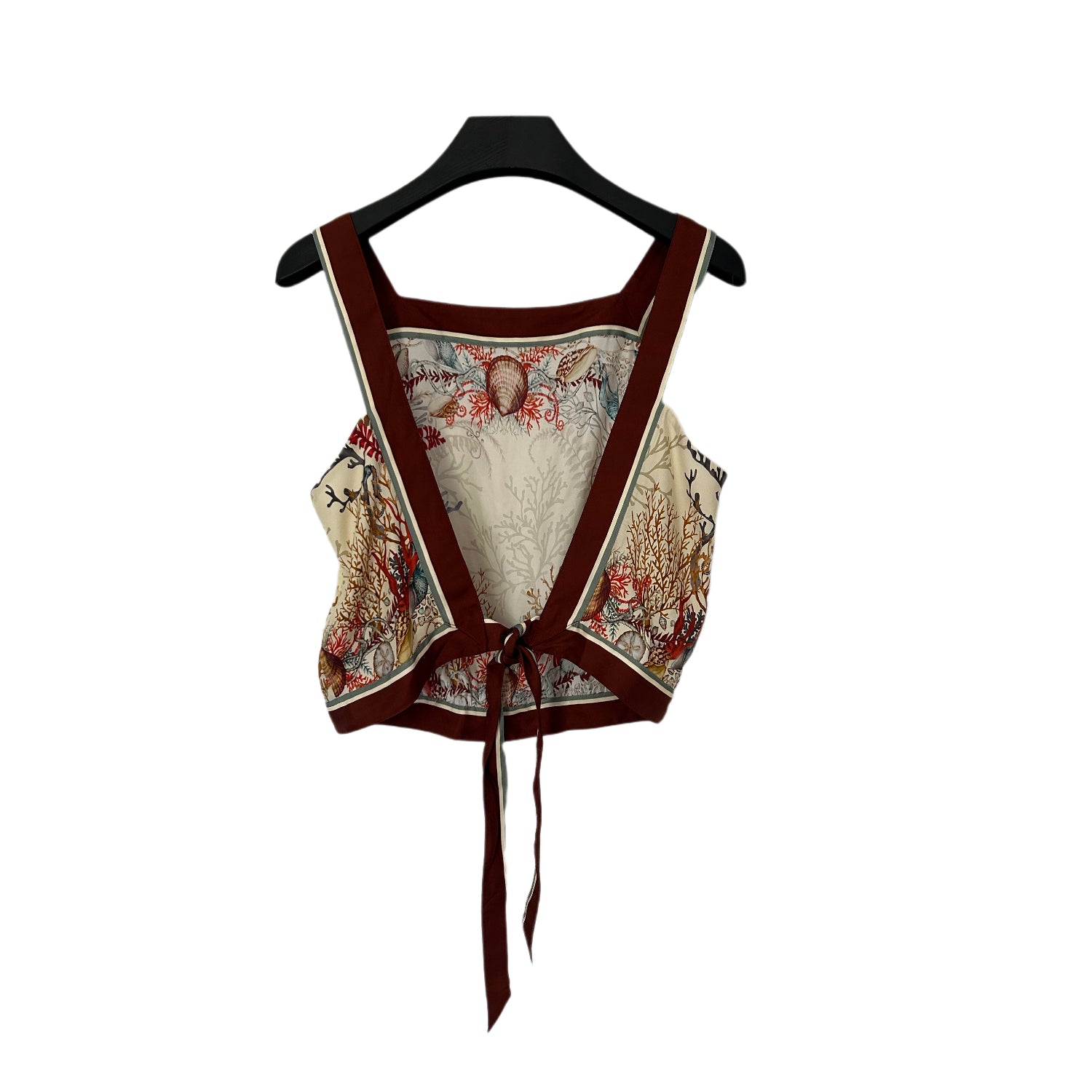 Features a sleeveless open-back silhouette in buttery silk-viscose twill, a coastal print with intertwining seashells, kelp and coral. Placed borders trim the neckline, hem, and trailing back ties. Authentic extra stock, with damaged brand tag, with material label. Retail price $298 USD.