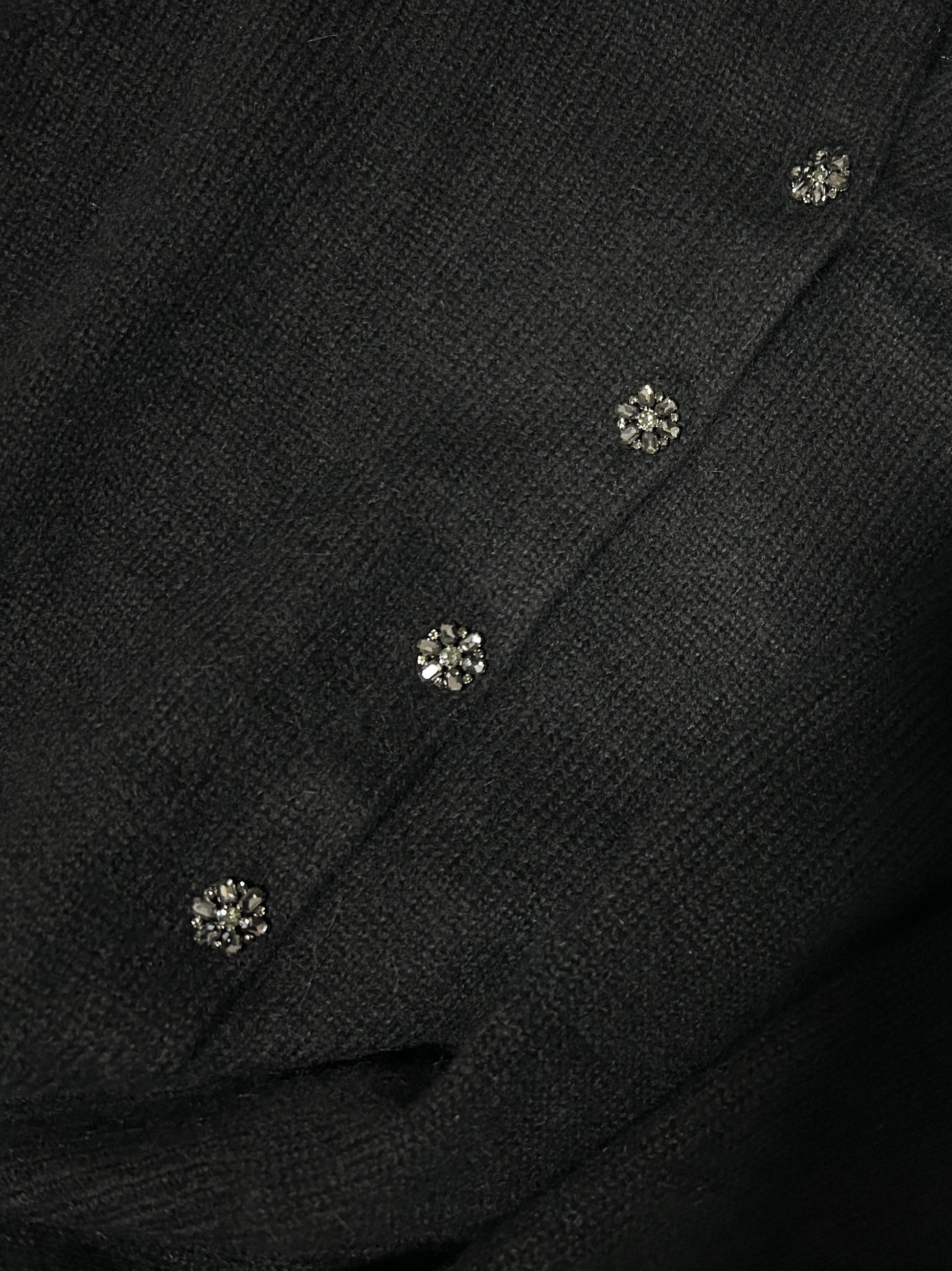 Features rhinestone fleurette buttons, a classic crew neckline, fitted raglan sleeves, and ribbing at the neckline, cuffs, and hem. Authentic overruns, without brand tag, material tag is replaced, only with original size tag. Retail Price $348 usd.